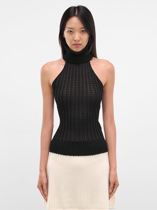 Black slim mini turtleneck in semi-sheer square rib-knit with raglan elongated sleeves and thumb slits.