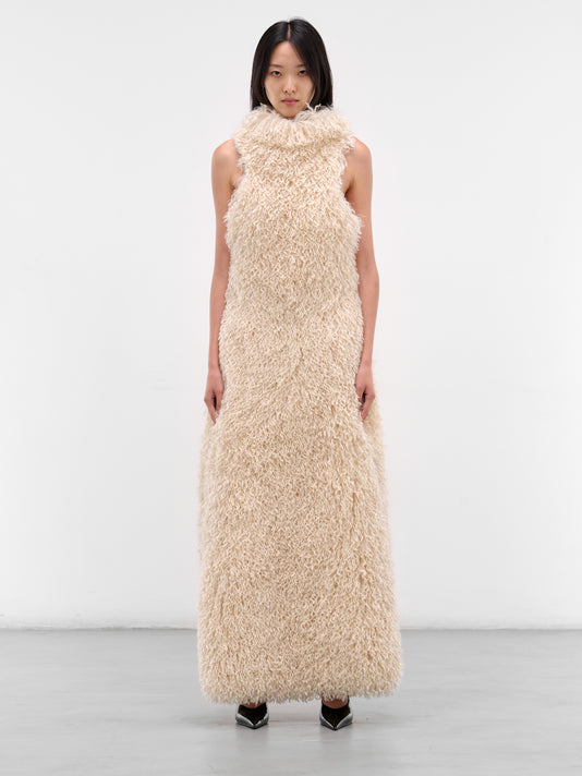 Brown sleeveless dress in soft faux fur with a subtle shine and fitted silhouette.