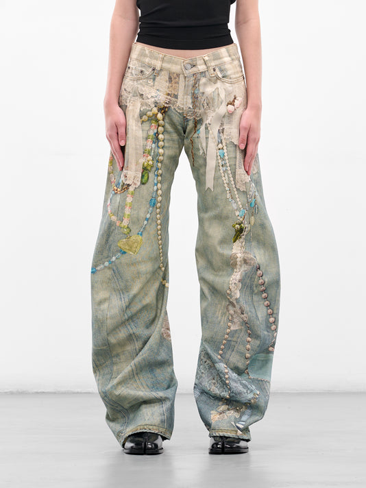 Textured denim trousers in green-yellow tint over indigo, achieved through signature dyeing and flocking, cut loose with front creases.