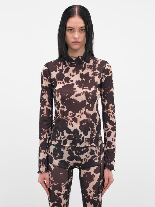Mesh long-sleeve t-shirt with trompe l’œil bear print and funnel neck, designed as a fitted second-skin layer.