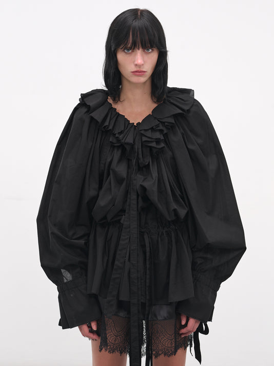 A black cotton poplin top with a cropped oversized silhouette and voluminous ruffled hems. Balloon sleeves, gathered cuffs, and self-tie draping at the back complete the layered construction.