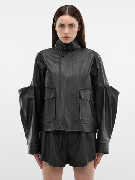 Black bomber jacket constructed in viscose with a pinstripe pattern and cropped proportions.