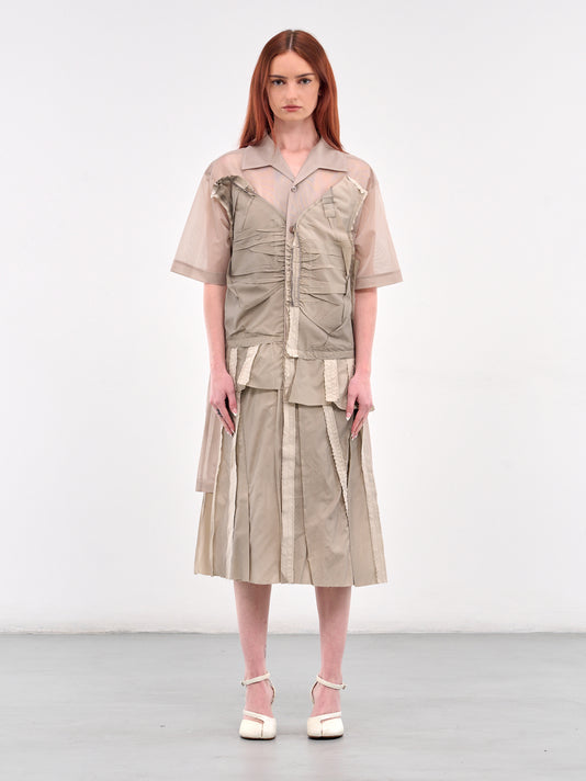 A white deconstructed T-shirt dress in cotton jersey with layered graphic prints. Raw hems, asymmetric draping, and diagonal seam detailing define the relaxed midi-length silhouette.
