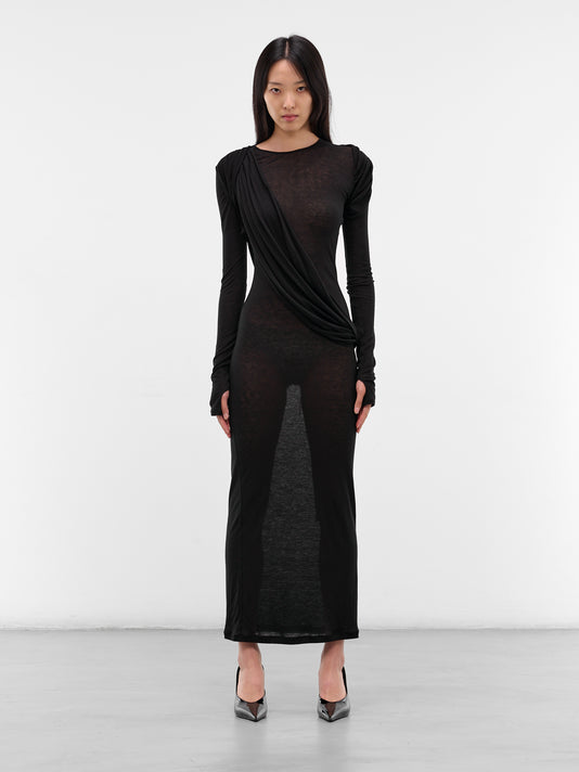 A black wool-alpaca knit dress with a sculptural back design. The cross straps, cut-outs, and tie fastening contrast structure with fluid layering.