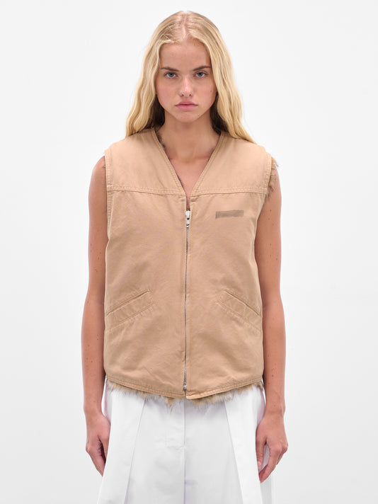 Featuring:• Relaxed fit• Ribbed crewneck• Front button placket closure• Sleeveless with armholes• Flap pockets• Adjustable drawstring at waist• Made in China• 65% Wool 35% Nylon• Standard sizing