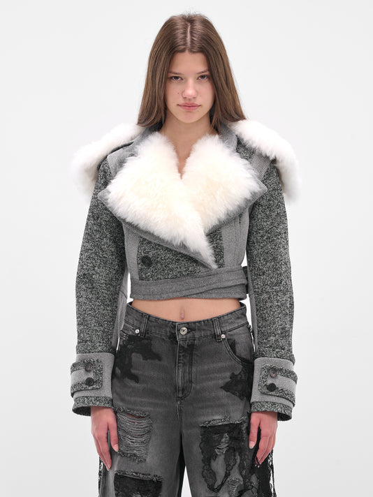 Featuring:• Oversized fit• Wool construction with long-pile vegan fur trim• V-neckline• Structured shoulders and long sleeves• Cuff vents• Cropped length• Made in France• Main: 100% Virgin Wool | Secondary: 70% Modacrylic 30% Recycled Polyester• Standard sizing