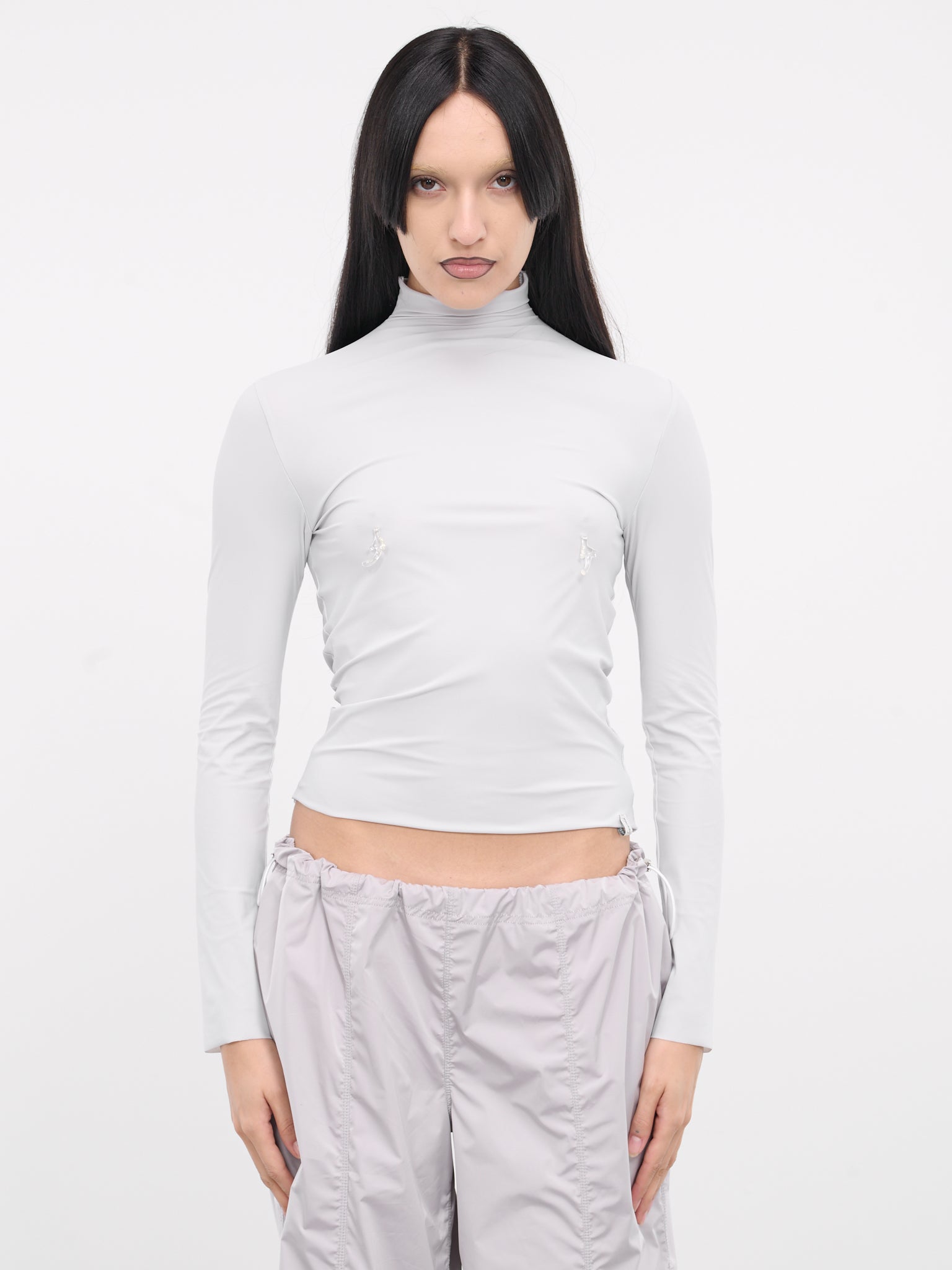 CHRISTINA SEEWALD top in stone, turtleneck design, nylon-lycra blend, paneled construction, turtleneck, long sleeves, chest drop embellishment, hem logo flag, straight hem, slim fit.