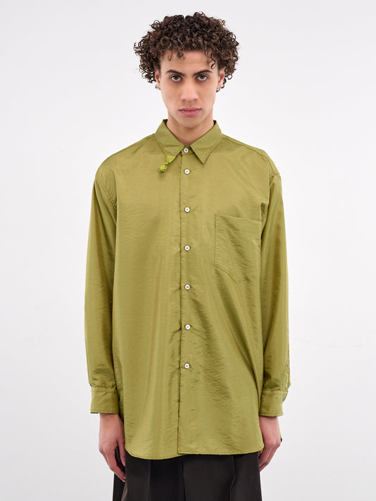 A khaki green shirt in cotton with an all-over abstract print and contrast solid paneling. The relaxed silhouette is finished with a chest patch pocket and shirttail hem.