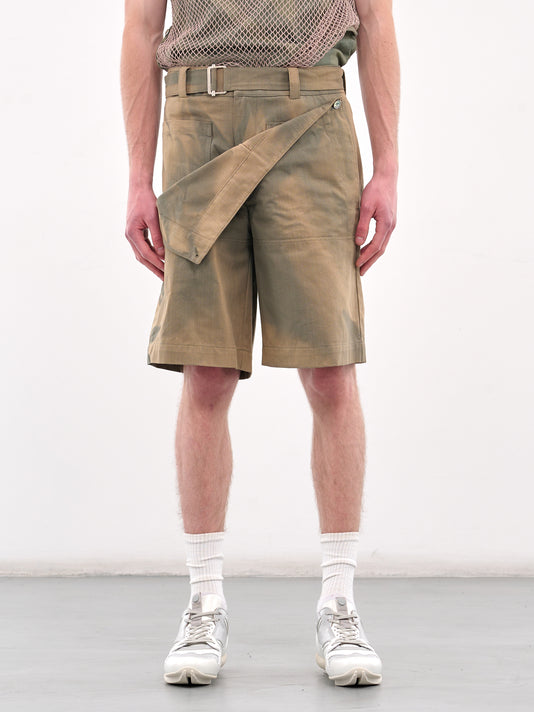 Khaki green shorts with a straight relaxed cut, accented by zip detailing throughout. A four-pocket structure and belt loops keep the knee-length silhouette utilitarian.