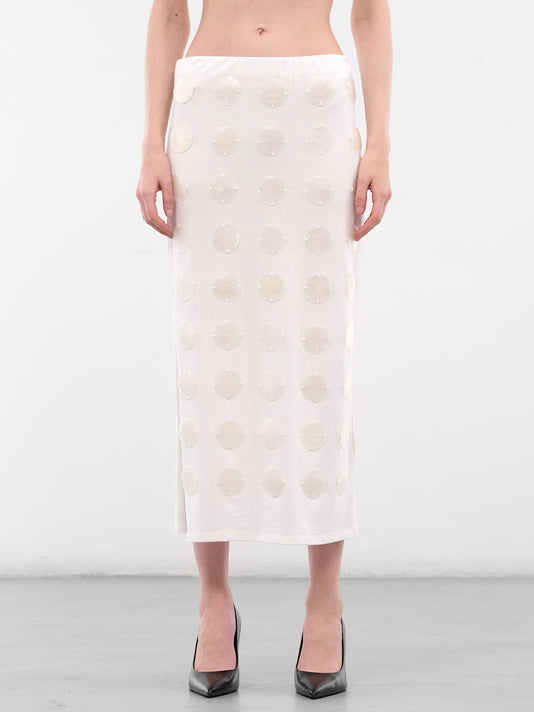 White cotton ringer tee with graphic print, front MOP sequin embellishment, and contrast crewneck and hems.