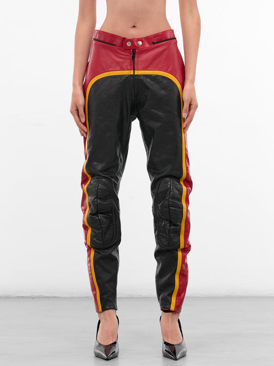 White and brown deconstructed trousers in mixed-material paneling with contrast tones and rivet detailing.