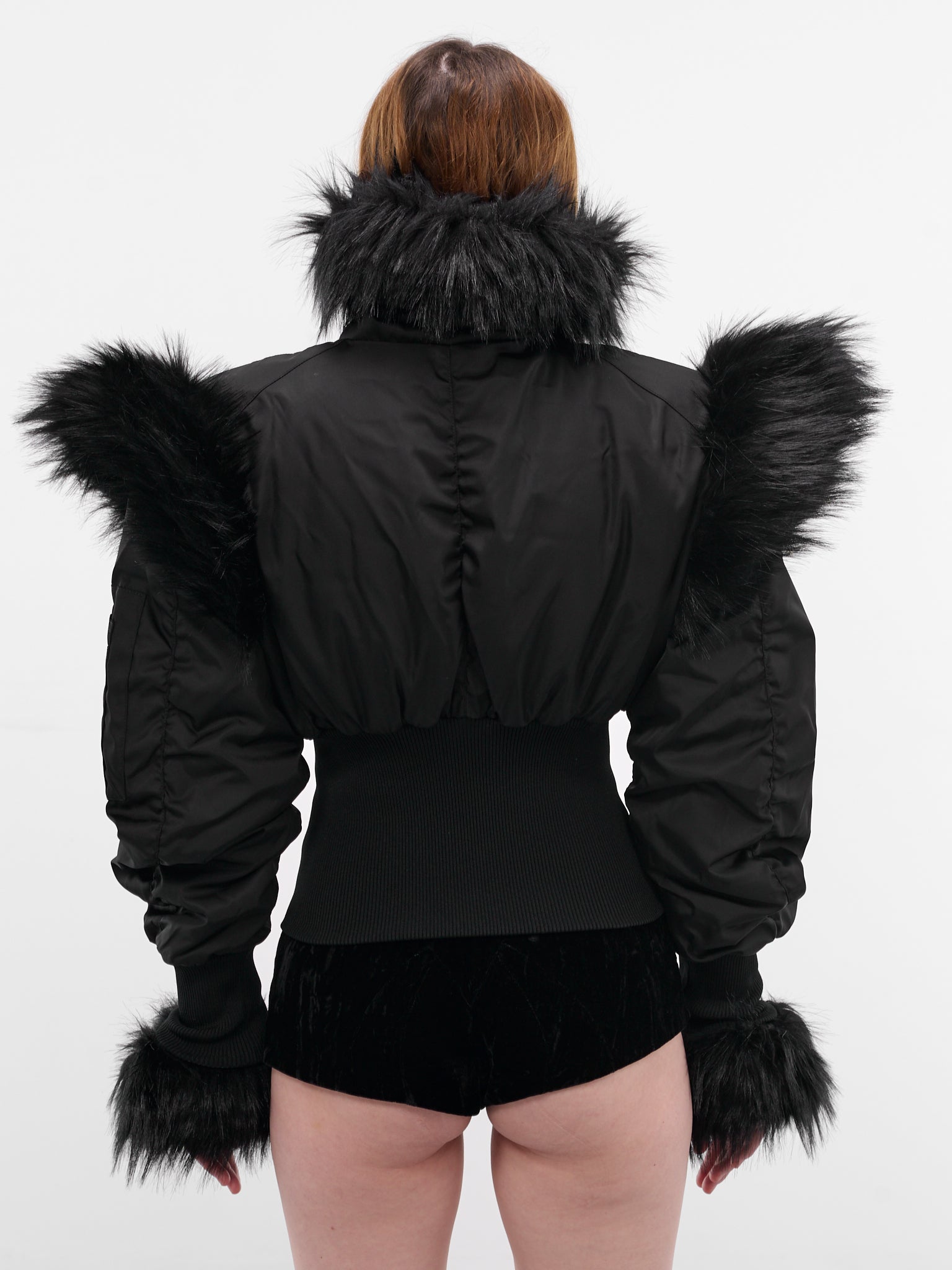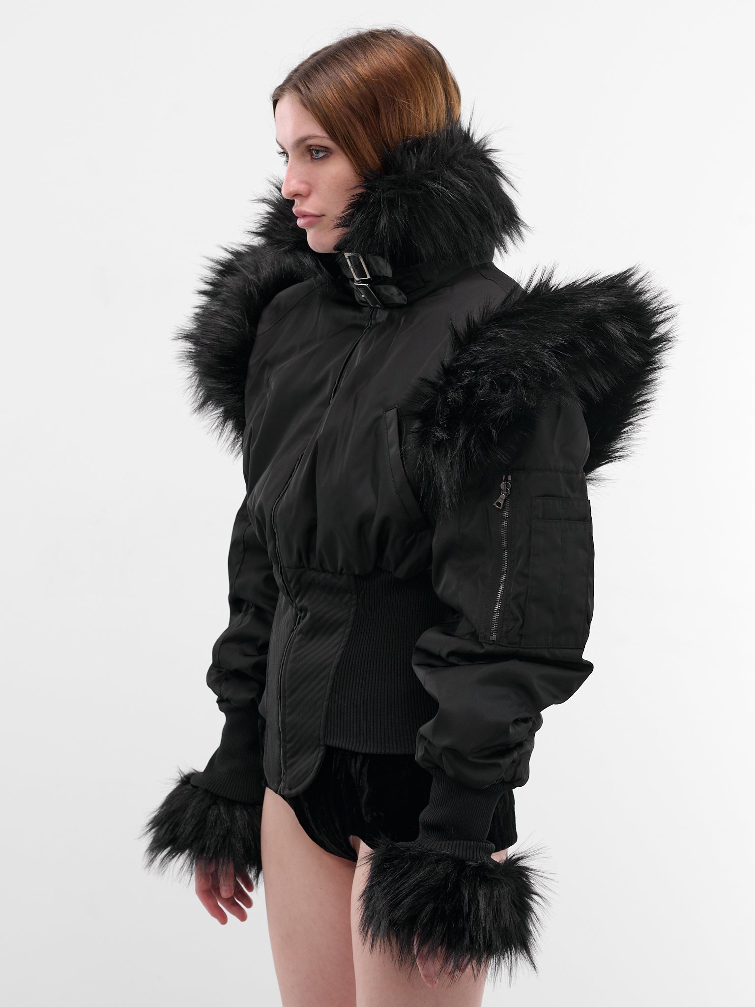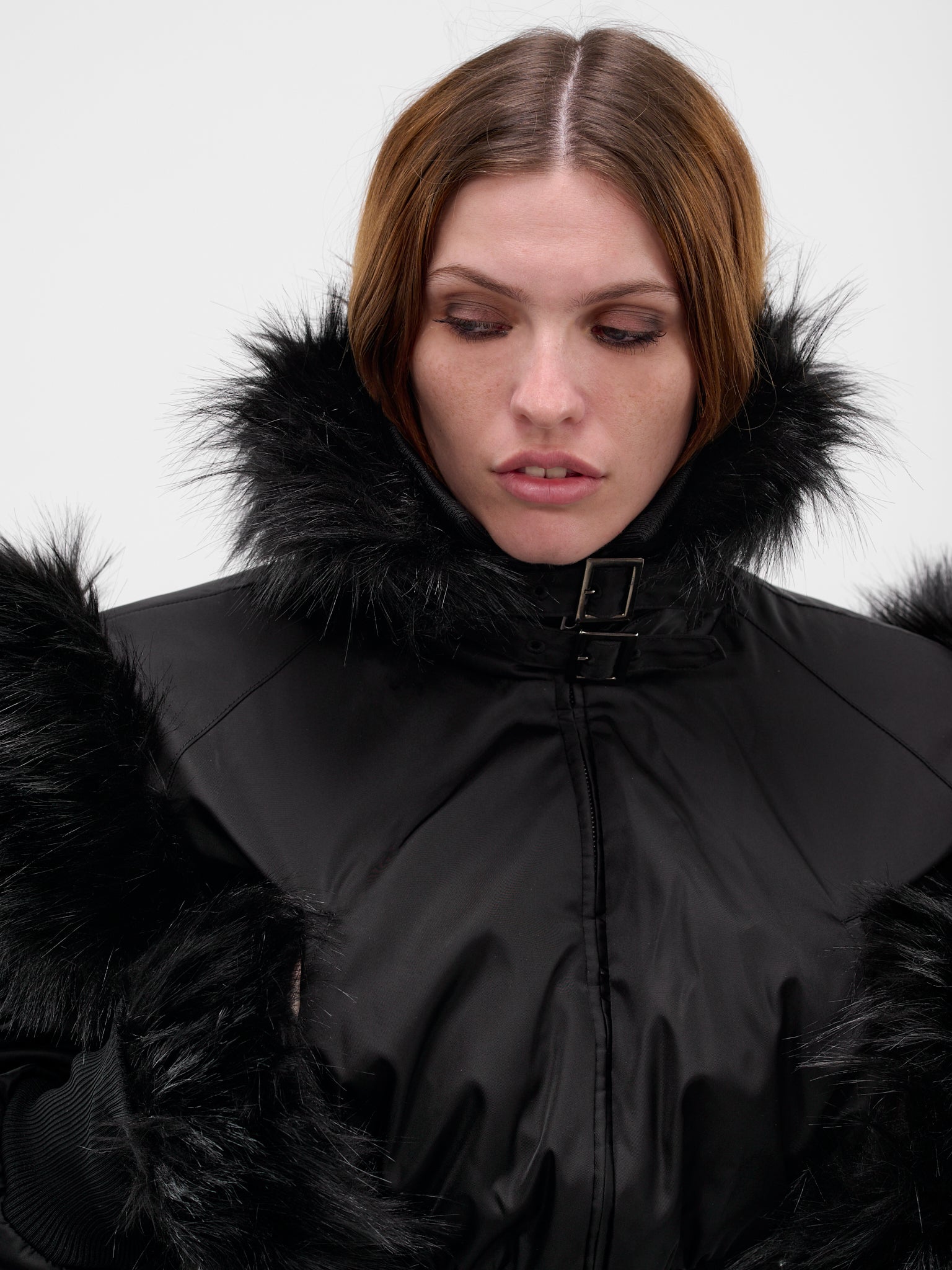 A black bomber jacket with fur trim and a belted high neck. The oversized silhouette contrasts structured shoulders with voluminous cuffs and rib-knit finishes.