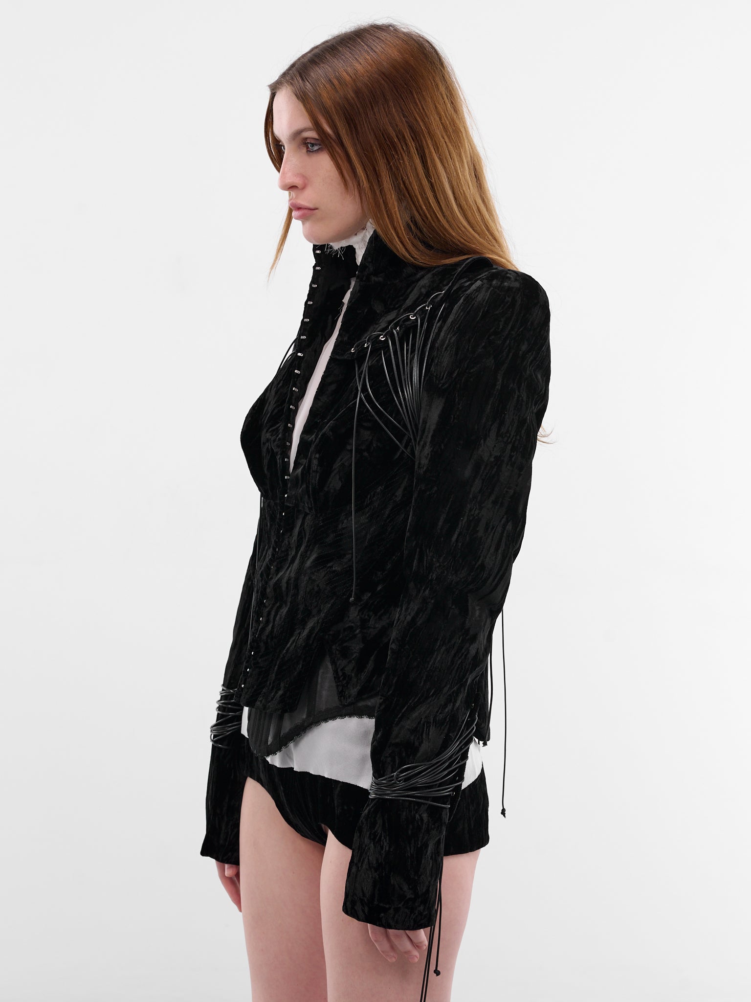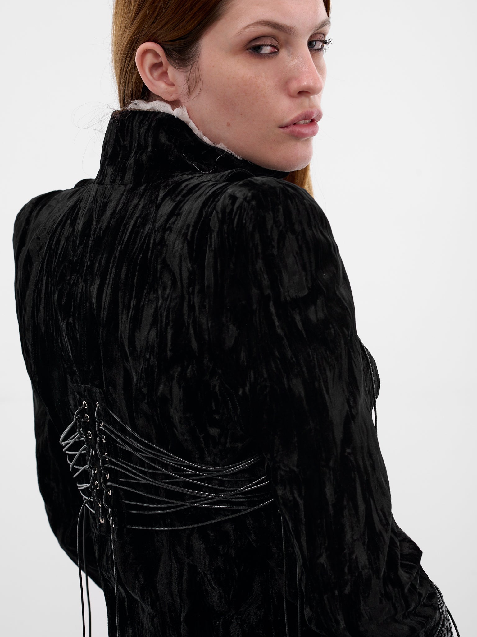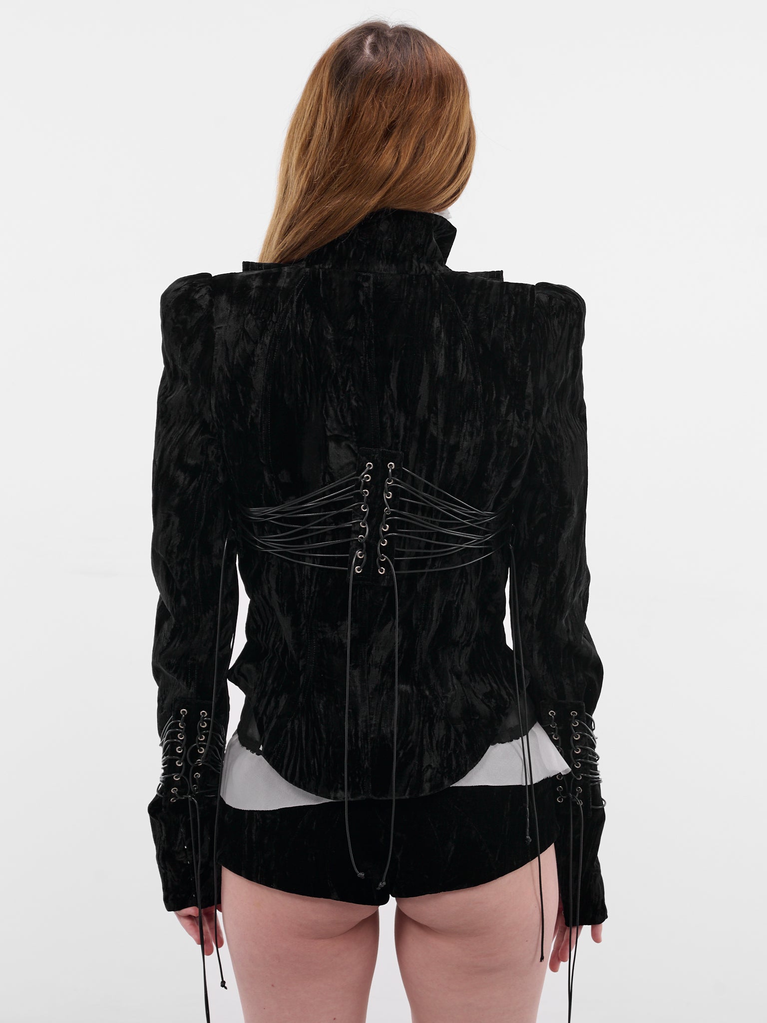 A black textured jacket with lace-up detailing throughout. The structured shoulders, corset-style hem, and hook-eyelet closure define a tailored, architectural shape.