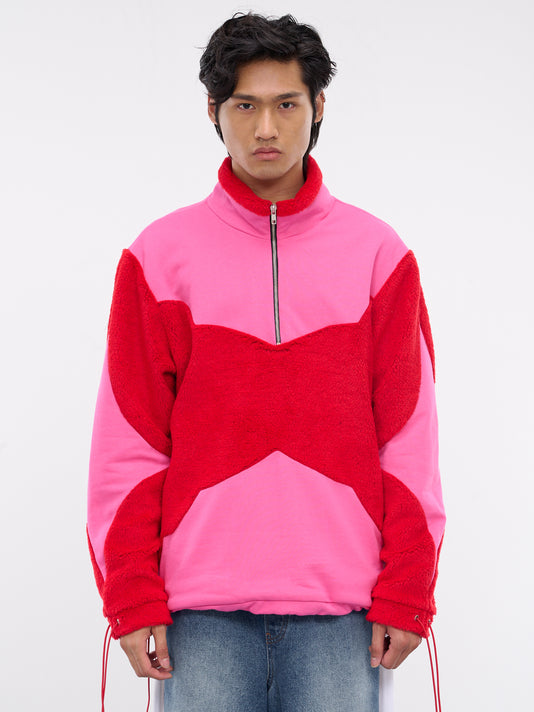 A pink hooded robe in short-pile fleece features all-over cat and heart graphics, double-breasted hook-eyelet closure, and a sculptural self-tie belt at the waist. Dropped shoulders and oversized fit push the playful volume.