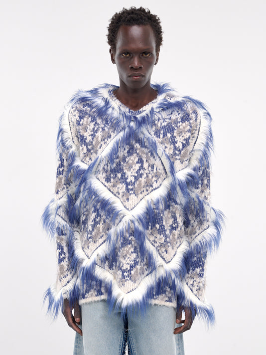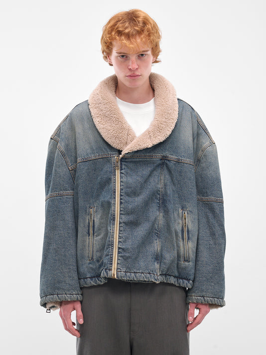A blue varsity jacket in shearling with oversized proportions and seasonal embroidery. The concealed placket, stand collar, and lined interior complete the layered construction.