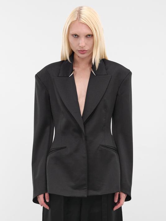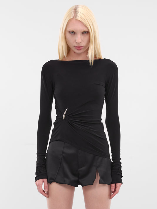 Black wool-rayon shorts with asymmetric hems and silver-tone hardware at the back.