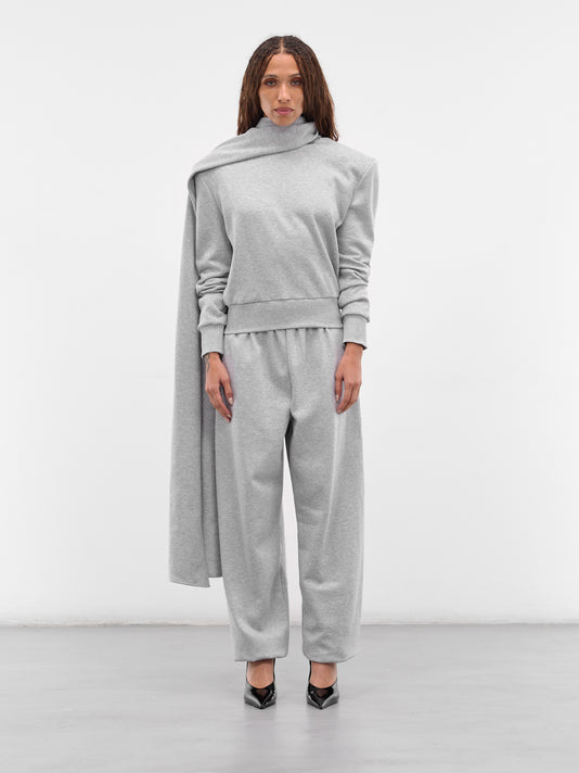 A gray melange cotton sweatshirt with a relaxed, slouching silhouette. The graphic print and rib-knit finishes lend a casual, textural balance.