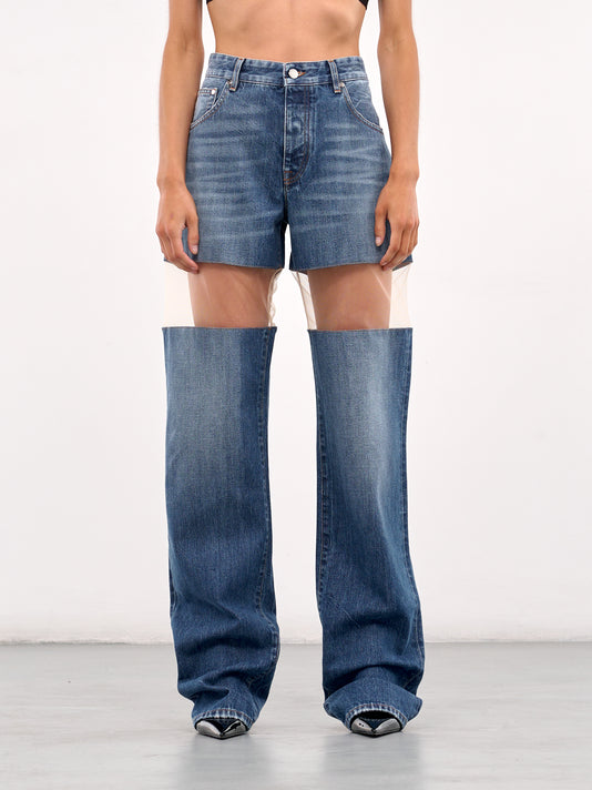 Blue and black jeans in cotton denim with contrast vegan fur paneling and zip detailing. The slim flared leg extends the low-rise silhouette.