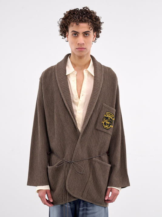 Off-white wool cardigan with kimono cardigan hybrid design and argyle cut-out pattern.
