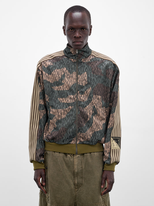 Navy track jacket with abstract tie-dye print and stripe piping at sleeves.