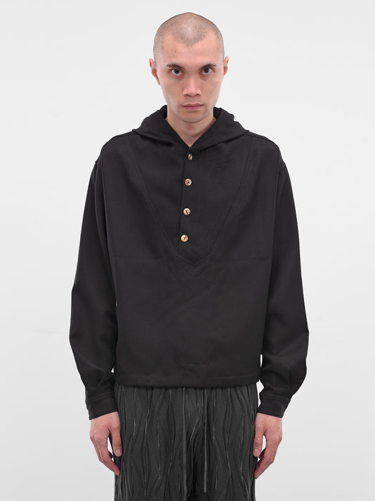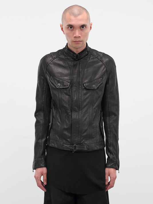 Kraner cropped jacket in black calf leather with a soft tumbled finish, layered front paneling and zip vent cuffs.