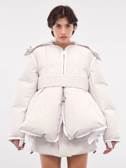 The ecru Mabel bomber features a layered puffer design with padded quilting and vegan fur trim at the hood. Layered sleeves, adjustable bungees, and oversized proportions reinforce its sculptural shape.