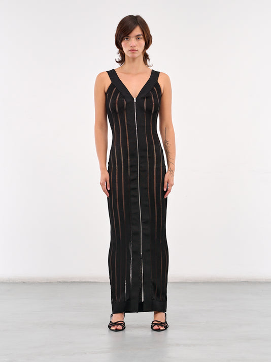 The black Uma dress layers semi-sheer and perforated mesh with structured paneling. A partially open back and detachable ruffle skirt finish the garter-strap mini-length silhouette.