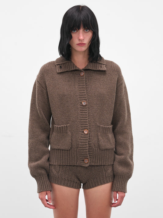 A fitted virgin wool cardigan framed with contrast appliqué patches that mimic the reverse side of embroidered fabric. Finished with ribbed trims, raw-edged overlays, and Maison Margiela’s signature four stitches at the back.