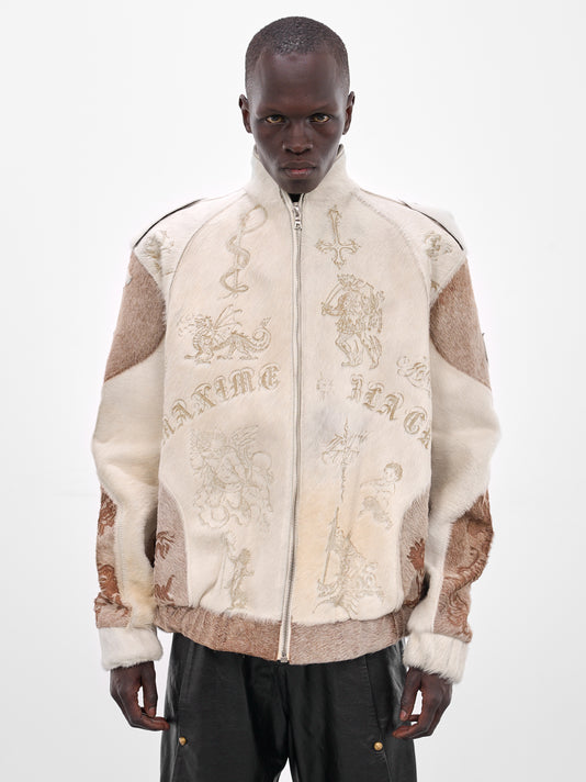 Black jacket with ribbed stand collar, embroidered graphic patches, and debossed graphics at the sleeves.