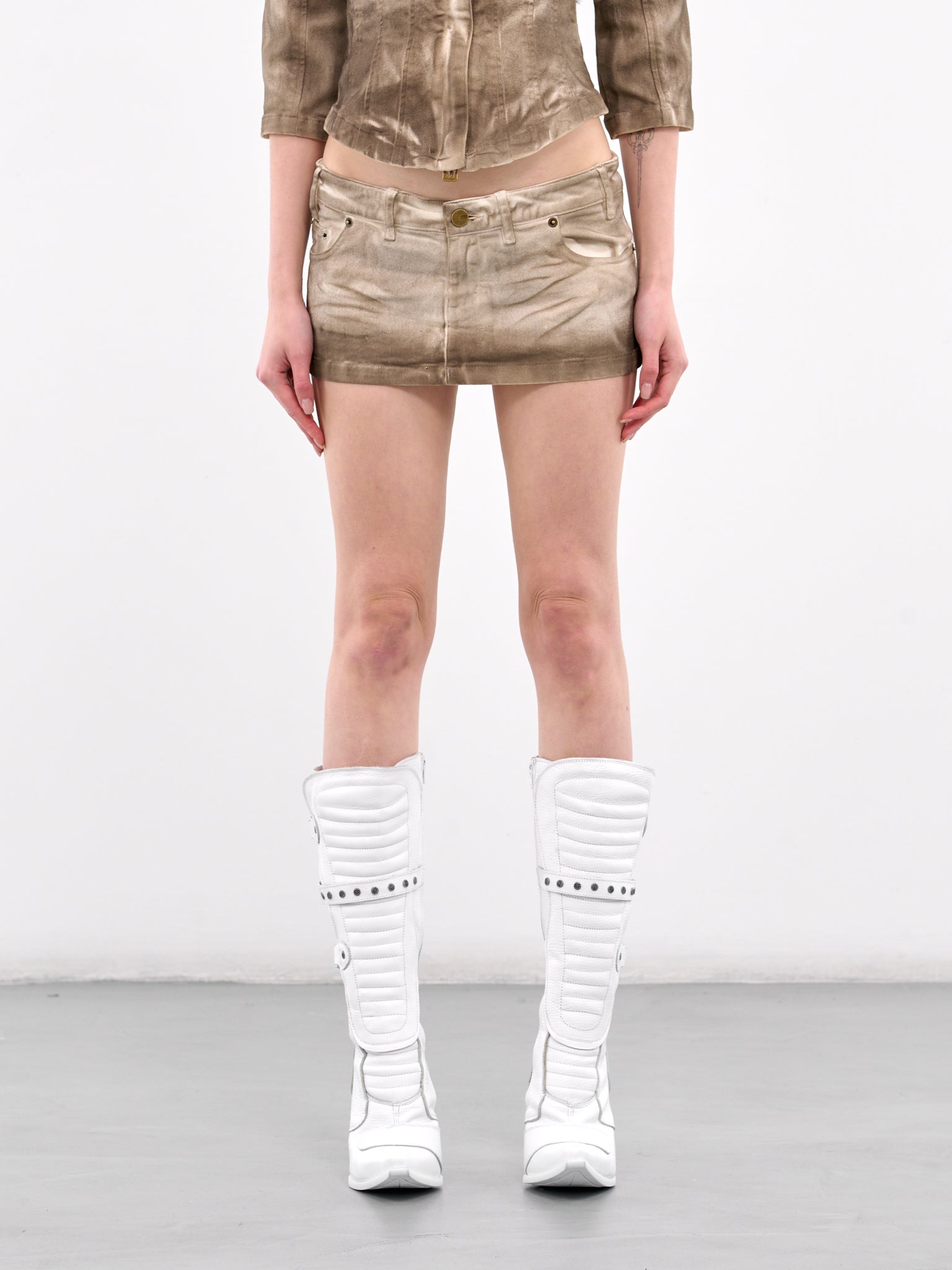 MOWALOLA x MISS SIXTY skirt in beige, paneled denim construction, dirtied effect, fading & whiskering, belt loops, back logo embroidery, front button & concealed zip fly closure, inset pockets, coin pocket, straight hem, mini-length, slim fit.