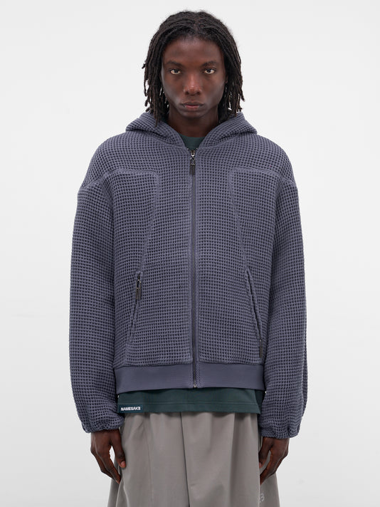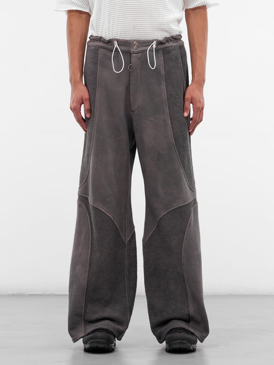 Gray nylon trousers in wide leg with wrap front detailing and side cargo pockets, lined throughout.