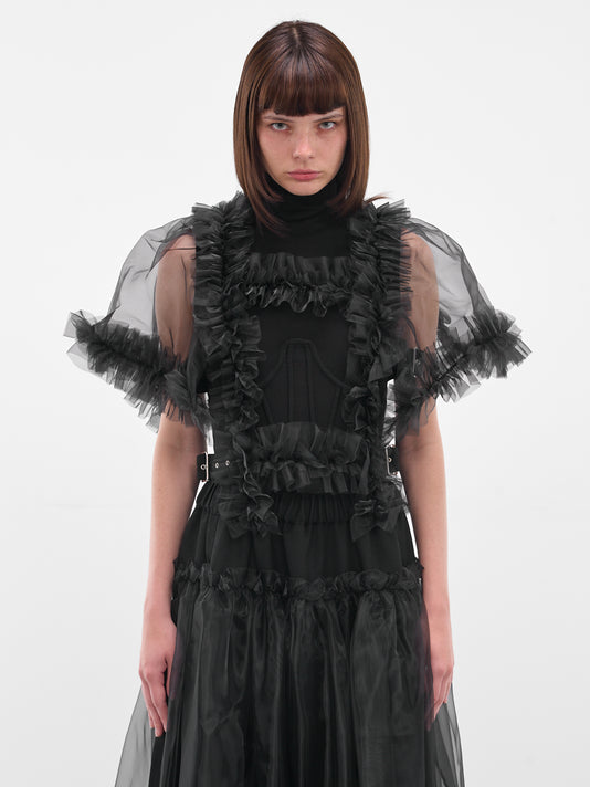 Featuring:• Fitted• Round neck• Short sleeves with shoulder cut-outs• Side pin-buckle fastening• Ruffle trims at edges• Made in Japan• Sleeves: 100% Polyester | Collar: 100% Wool• Standard sizing