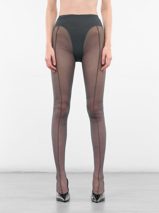Navy cotton leggings with padded hips and spiral piping. The high-waisted fit and skinny leg emphasize a sleek, contoured silhouette.