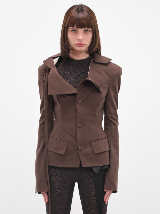 A brown sculptural bustier with a deconstructed strapless design. Draped bust detailing, raw hems, and a curved hem define the slim silhouette.
