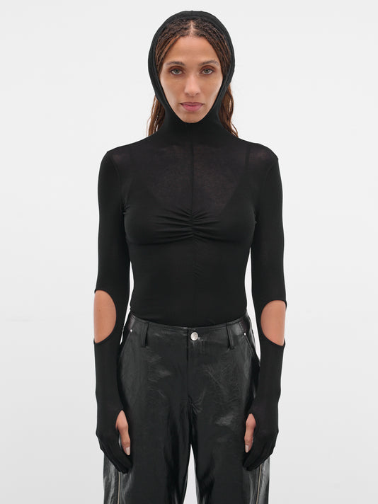 Black vegan leather trousers with spiral zip vents and a wide-leg profile. Belt loops and structured pockets bring utilitarian refinement to the curved cut.