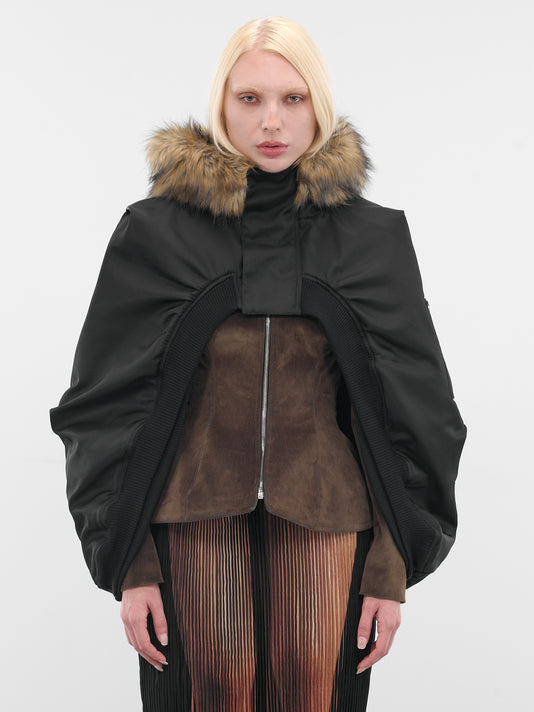 Black and brown maxi skirt in silk with trompe l’oeil illusion print and intricate woven pleating.