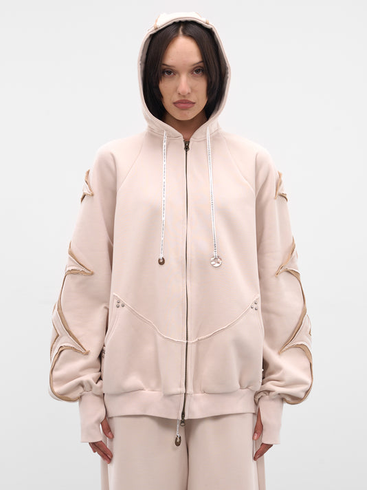 A chocolate cotton short jacket with detachable hood and wool trim, finished with ribbon charms and elongated rib-knit cuffs.