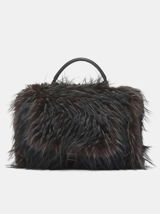 Green sweater in long-pile vegan fur, oversized with a bold graphic print across the front and open back detail.