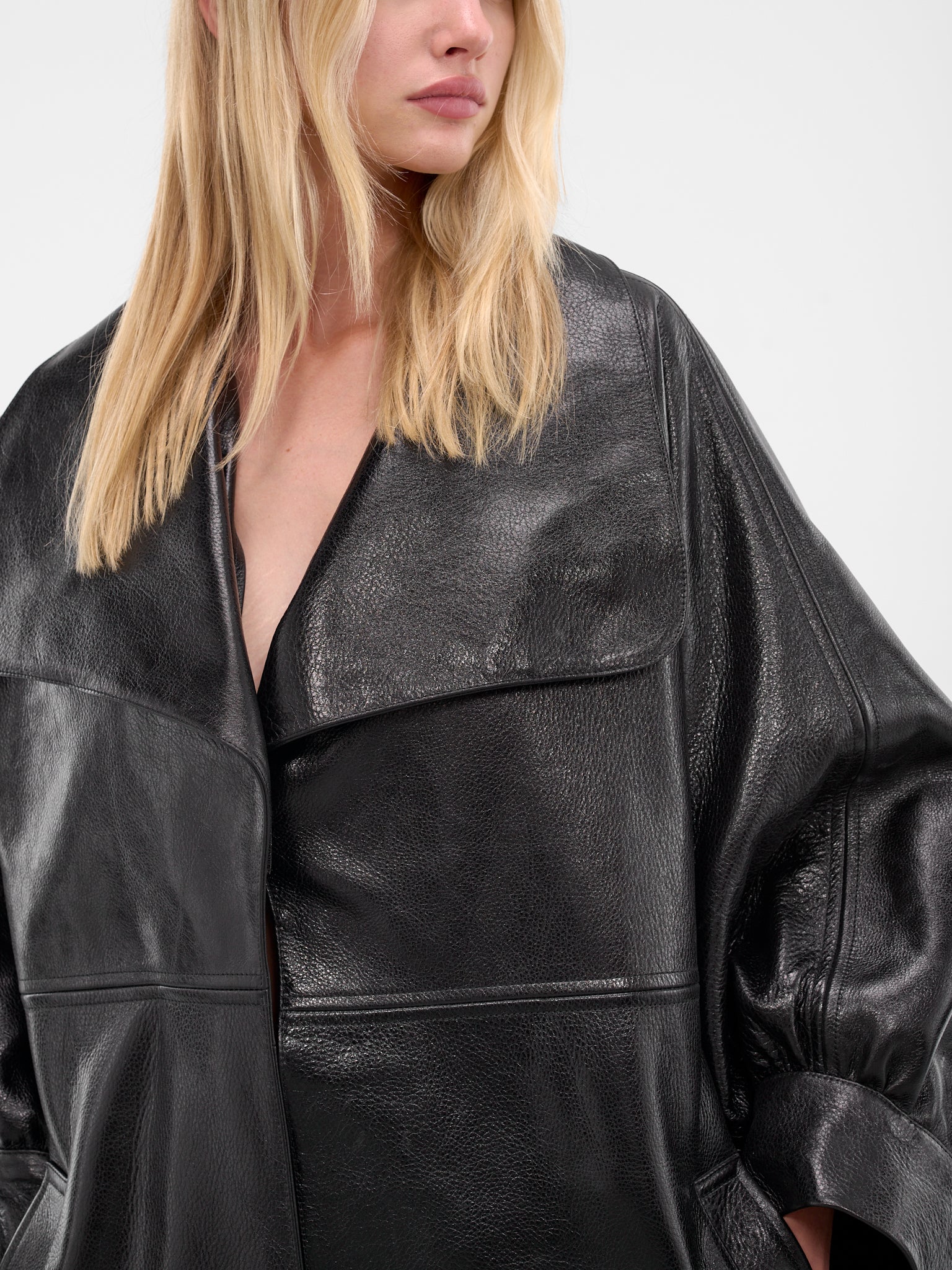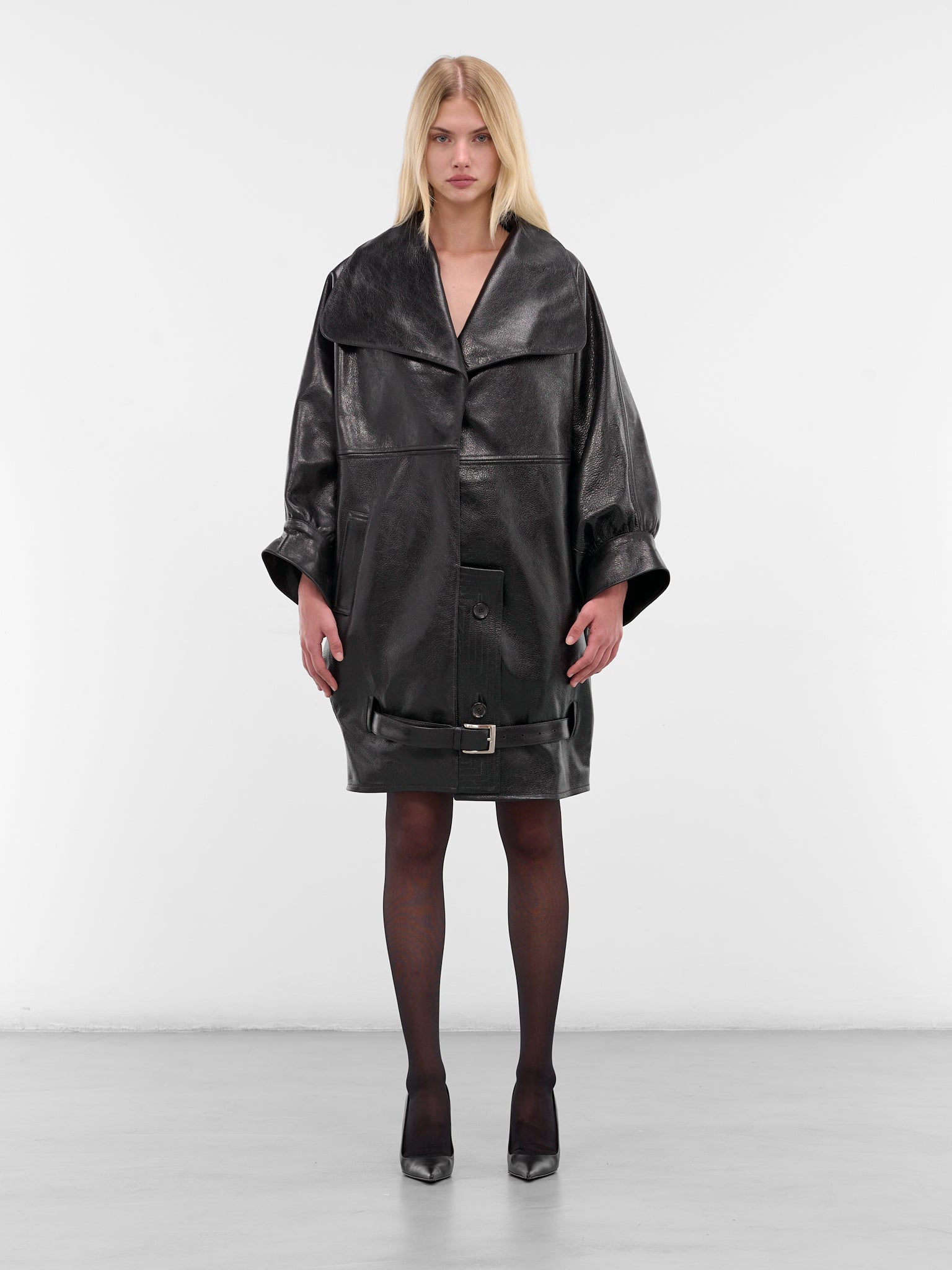 Featuring:• Oversized fit• Nappa leather construction• Wide collar• Long sleeves with gathered cuffs• Front button placket closure• Side pocket• Back draping with waist belt• 100% Nappa Leather• French sizing