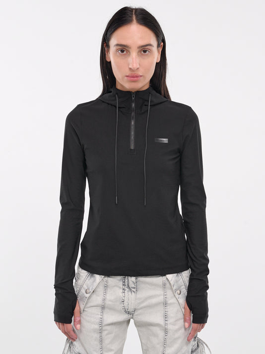 This black hoodie displays signature 'Polizei' graphic print across the chest. The two-way zip closure and logo-embroidered hood create utilitarian appeal through relaxed construction.