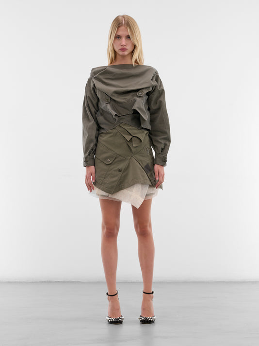 Beige maxi coat in an upside-down trench design, strapless with a straight neckline and inverted collar and storm flap reworked at the hem.