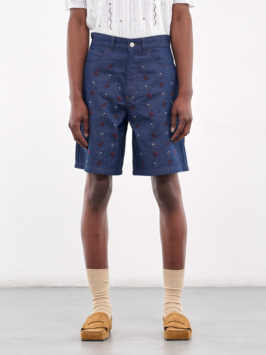 Denim shorts in baggy fit with wide leg, jacquard face pattern and below-knee length.