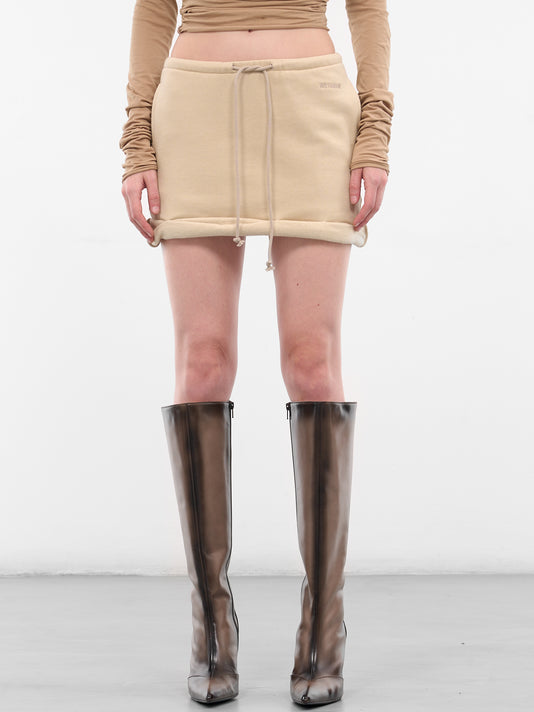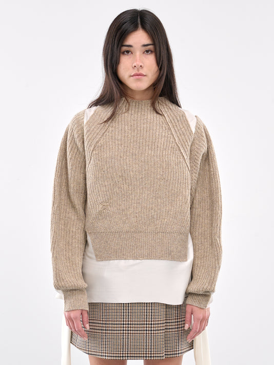 Beige hoodie in layered cotton with a slim profile, combining a rolled fleece overlay with a stretch jersey underlay for a textured, tiered finish.