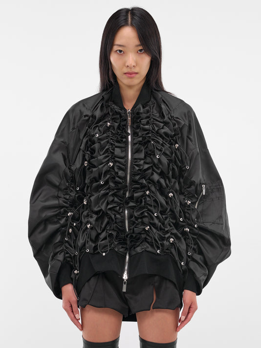 Featuring:• Oversized fit• Deconstructed bomber jacket design• Ribbed stand collar• Two-way zip closure• Layered flap and hood at shoulders• Contrast orange ruffling at hood• Long sleeves• Zip pocket at sleeve• Rib-knit cuffs and hem• Side pockets• Cropped length• Made in Japan• 100% Nylon• Standard sizing