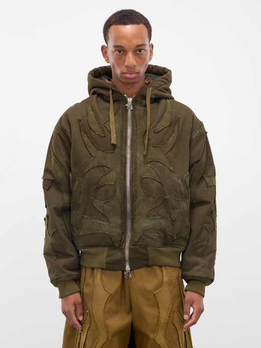 Beige linen shorts with graphic overlays and raw hems throughout. Designed with an elasticated waistband, side vents, and self-tie fastenings for adjustable styling.