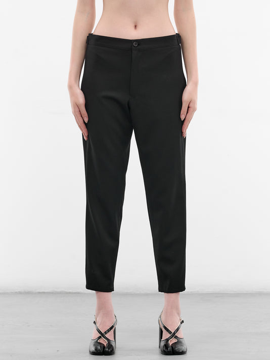 Dress in black designed like an overcoat with a notched lapel and side gathering.