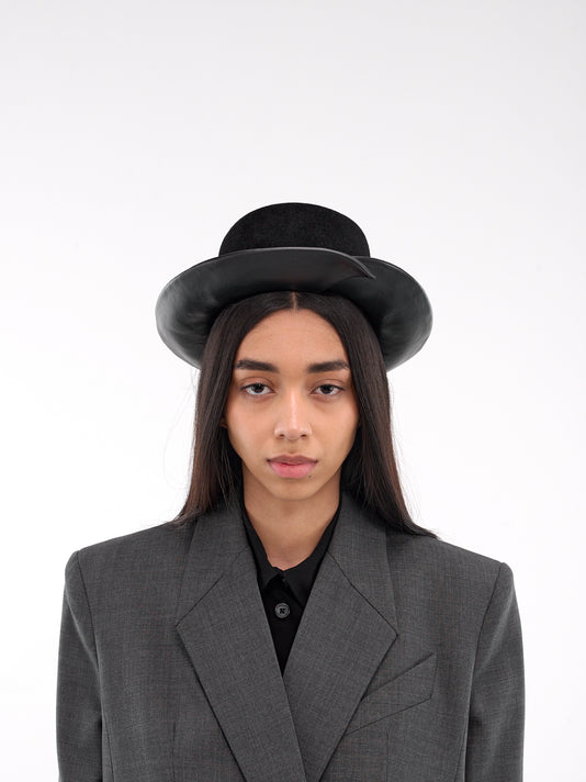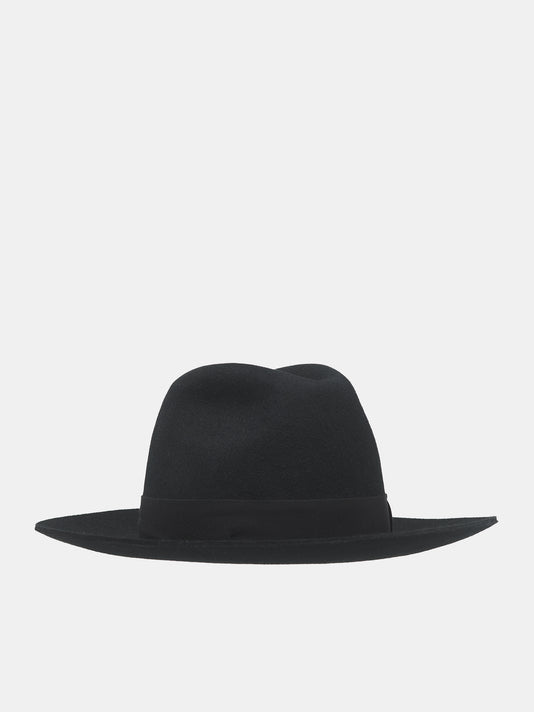 A black wool felt fedora with a pleated crown and brim, creating an elegant pinched structure. The versatile shape offers timeless wear across seasons.