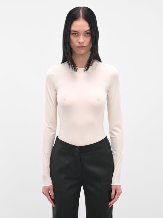 A white turtleneck top in high-twist cotton jersey with a crisp, lightweight texture. The soft drape, stretch, and subtle sheen make it ideal as a versatile layering piece.