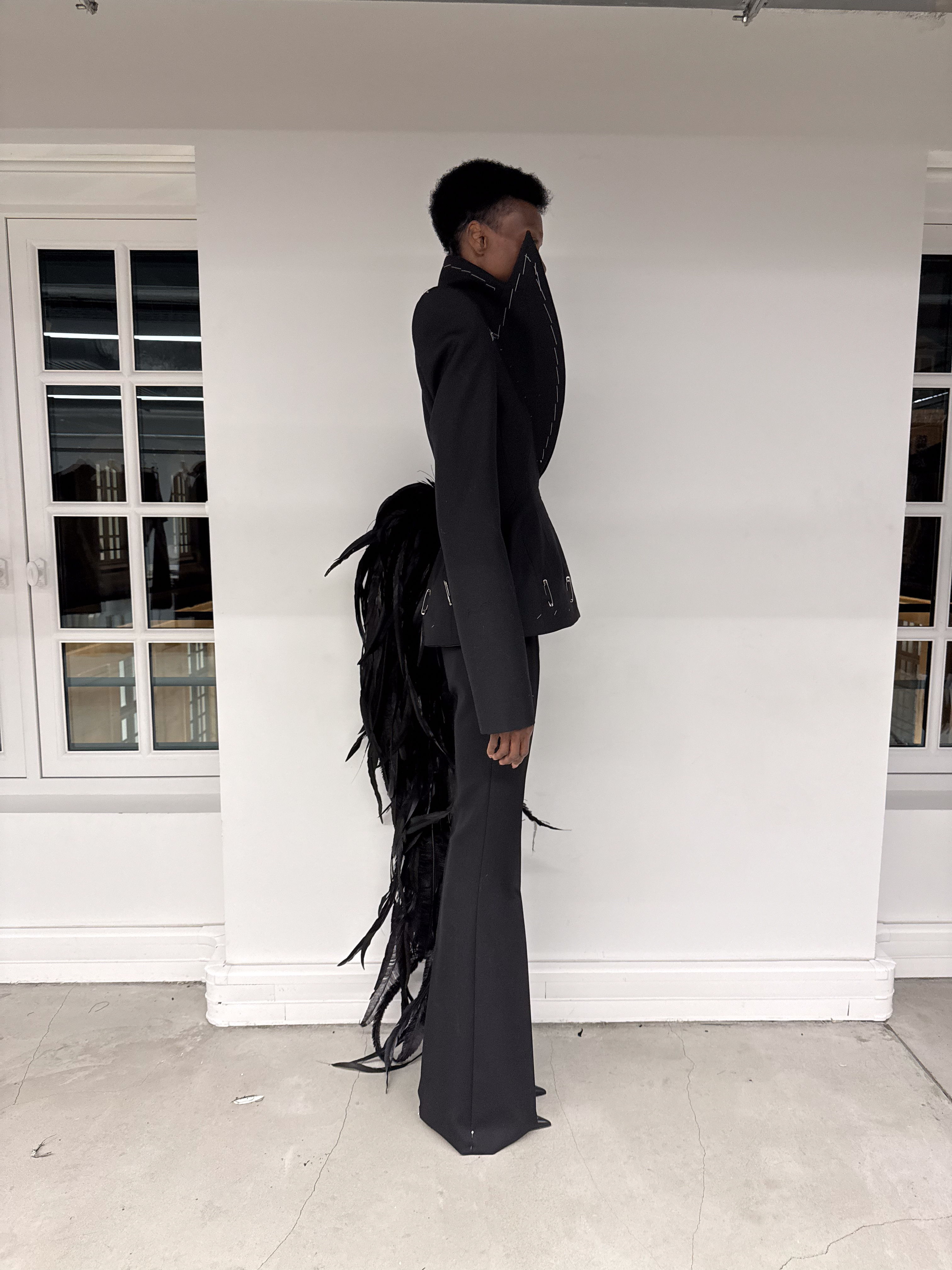 "The women's blazer was the first thing that I sketched. And that's the silhouette of Matières Fécales. It was perfecting the proportions. We wanted an enhanced, distorted shoulder, but it still had to be wearable. We spent almost a year and a half developing that one. "