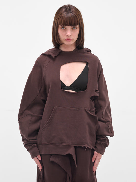 Brown sweatpants in a deconstructed design with draped front wrap detailing. Elasticated waistband, side pockets, and embroidered infinity symbols at the cuffs finish the relaxed silhouette.